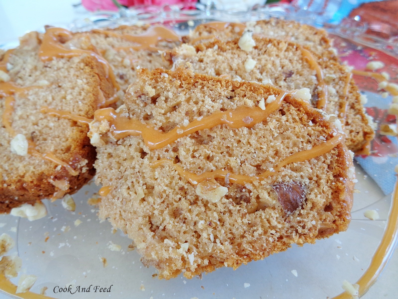 - Combine glaze ingredients and drizzle with a spoon over cake. Sprinkle with walnuts.